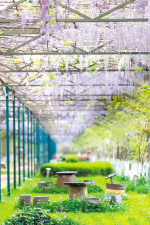 r步入平安福紫藤长廊,抬头望去,花架上已挂满串串花苞,像千万只紫色的风铃在春风里轻轻摇曳。细心的小伙伴会发现,部分早花品种的紫藤已经迫不及待地绽放了。淡紫色的花瓣如烟如雾,垂坠在长廊之上,阳光穿过花隙,洒下斑驳的光影,美得像走进了宫崎骏的动漫世界。预计还有半个月,紫藤将迎来全面盛放。