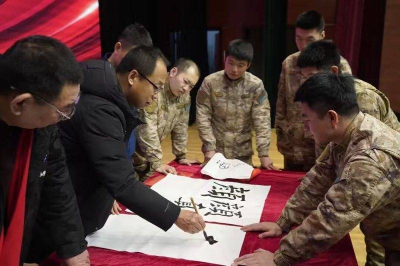 在互动交流环节,官兵们拿出自己的日常习作请老师们点评,书法家们不仅耐心指出改进方向,还结合部队生活特点,为官兵们量身创作书法作品。“铁血铸忠诚,保家卫国丹心在;金戈书壮志,拥政爱民鱼水情”“摸爬滚打练强军精兵”“踏开曙色跃新程”……一幅幅主题鲜明的作品,既有新春喜庆,更显强军豪情。